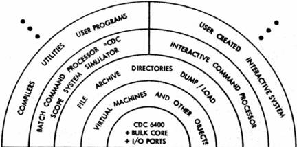 Extending a simple machine to a complex one may require several extension steps. This will give the implementation a layered appearance. The particular extension steps we chose are depicted in Figure 1. A bare machine was extended to a class of simple virtual machines, each with a virtual memory. These virtual machines are extended to have operations on a global file system. The file system machine is extended to accept commands, control the actions of the virtual machine, and to interpret file system naming. Most programs run “on top of” this machine, extending it in various ways.