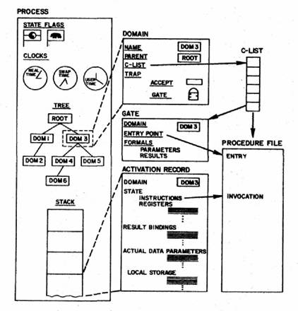 Processes, domains, and gates will be discussed in greater detail below. A gate is an entry point into a domain. A domain is a sphere of protection (or a name space) within a process. A process is a scheduling and accounting entity. It may be thought of as the envelope containing a virtual processor.