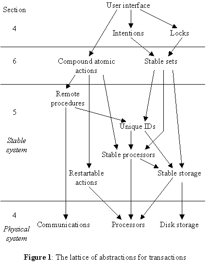 Starting from this base, we build up the lattice of abstractions shown in figure 1. The second level of this lattice constructs better behaved devices from the physical ones, by eliminating storage failures and eliminating communication entirely (section 5). The third level consists of a more powerful primitive that works properly in spite of crashes (section 6). Finally, the highest level constructs atomic transactions (section 7). Parallel to the lattice of abstractions is a sequence of methods for constructing compound actions with various desirable properties. A final section discusses some efficiency and implementation considerations. Throughout we give informal arguments for the correctness of the various algorithms.