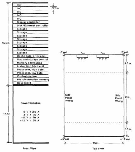 The Dorado fits into a very compact package, illustrated in figure la; a high-level block diagram is shown in figure Ib. Circuits are mounted on large, high density logic boards (288 logic packages/board). The boards slide horizontally into zero-insertion-force connectors mounted in dual backpanels (“sidepanels”); they are .625 inches apart. This density makes it possible to reconcile the goals of size and capability. Certain sacrifices are made, however. For example, it is not possible to access every signal with a scope probe for debugging and maintenance. We make up for this by providing sophisticated debugging facilities, diagnostics, and the ability to incrementally assemble and test a Dorado from the bottom up.