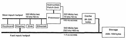 It is also desirable to make I/O transfers through the processor. To this end there is an I/O address and a data bus for direct access to I/O controllers. The data bus can transfer one word per cycle, or 320 Mbits/second, and both the memory reference and the I/O transfer can be specified in a single instruction, so that it is possible to move a sequence of words between the cache and a device at this rate. However, this subsystem is called the slow I/O system. There is also a more direct memory access I/O subsystem, the fast I/O system; it allows data to move directly between memory and I/O devices, in blocks of 16 words, without polluting the cache memory. Figure 1b shows a display controller that uses both slow and fast I/O systems.
