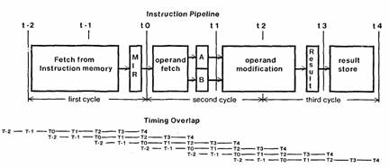The instruction pipeline, illustrated in figure 2, requires three cycles (divided into six half cycles) to completely execute a microinstruction. The first cycle is used to fetch it from microstore (time t-2 to t0). The result of the fetch is loaded into the microinstruction register MIR at t0. The second cycle is split; in the first half, operand fetches (as dictated by the contents of MIR) are performednd the results latched at tt in two registers (a and B) which form inputs to the next stage. In the second half cycle, the alu operation is begun. It is completed in the first half cycle of cycle three, and the result is latched in register RESULT (at t3). The second half of cycle three (t3 to t4) is used to load results from RESULT into operand registers.