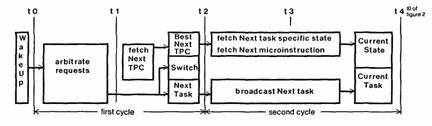 Figure 3 shows the task arbitration pipeline. This pipeline is two stages long, and also requires one cycle per stage. At the beginning of the pipeline (t0), wakeup requests from device controllers are latched into the WAKEUP register. During the first half cycle (t0-t1), arbitration is performed and the highest priority task determined. During the second half cycle (t1-t2). the microprogram address for the highest priority task is fetched from the task specific program counter TPC. The task number, its TPC, and the command to switch tasks (if the highest priority task is higher than the currently executing task) are loaded into registers at t2. In the second pipe cycle, the TPC is used to fetch the next microinstruction from the microstore, the entire processor uses the selected task number to fetch the appropriate task specific information, and device controllers are told which task will have the processor next. Finally, at t4 the task switch is complete, and the new task is in control of the processor; this time corresponds to t0 of the first microinstruction executed by the new task.