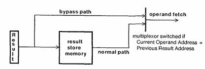 Recall that a microinstruction is initiated at the beginning of every cycle, but takes one cycle for instruction fetch, and two cycles for execution. If an instruction uses a result generated by its immediate predecessor, it needs to get that result from an operand register before the predecessor has actually delivered the result to that register. Rather than forbidding such use of results, or delaying execution until the register has been loaded, we solved this problem with a technique called bypassing. The hardware detects that an operand specified in the current instruction is actually the result of the previous instruction. Rather than obtaining the operand from the usual source in a RAM, the processor takes it directly from the input to the RAM, which is the result of the previous instruction. Figure 4 illustrates the scheme. This costs extra hardware for multiplexors and bypass detection logic, but the result is much smaller and faster microcode in many common cases. In the Model 0 Dorado, we omitted bypassing logic in a few places, and required the microcoder to avoid these cases. The result was a number of subtle bugs and a significant loss of performance.