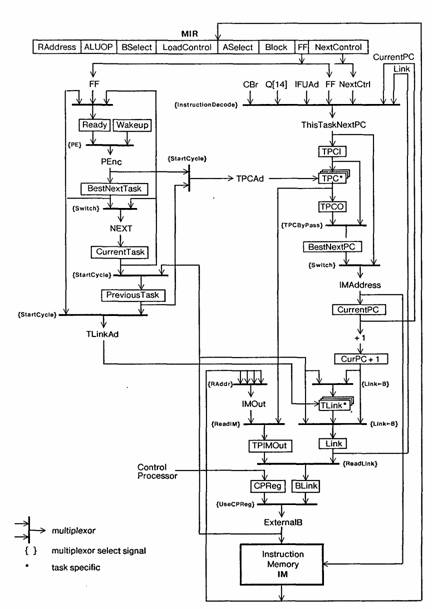 Refer to the right hand side of figure 5. At t0 of every instruction, the microinstruction register MIR is loaded from the outputs of IM, the microinstruction memory, and the CurrentPC register is loaded with IMAddress. The NextPC is quickly calculated based on the NextControl field in MIR, which encodes both the instruction type and some bits of NextPC; see figure 7 for details. This calculation produces ThisTaskNcxtPC, so called because if a task switch occurs it is not used as the next IMAddress. Instead, the BestNextPC computed in the task pipeline is used as IMAddress.