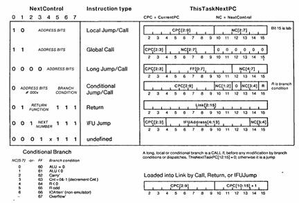 The alternative, which we make use of in the Dorado, is to divide the microstore into pages, use a few bits to specify a next address within the current page, and have a type field which can specify branches, calls, returns, transfers to another page, or whatever. At the start of a micro-cycle, the processor decodes the type field and accesses other information (such as the current page number or the return link) to compute NextPC. In addition, some types cause side effects such as loading the return link. The net result is substantially fewer bits to control microsequencing than a horizontal scheme would require (in the Dorado, 8 bits instead of about 16). The disadvantages are, of course, the cost and time for decoding this field, and the additional complexity of an assembler that can fit instructions onto pages appropriately.
