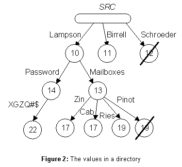 ANSI/DEC/SRC/TJW is the link ANSI/IBM/TJW, then ANSI/DEC/SRC/TJW/CJS has the same value as ANSI/IBM/TJW/CJS.A directory is not simply a mapping from simple names to values. Instead, it contains a tree of values (see figure 2). An arc of the tree carries a label (L), which is just a string, written next to the arc in the figure. A node carries a time-stamp (TS), represented by a number in the figure, and a mark which is either present or absent. Absent nodes are struck through in the figure. A path through the tree is defined by a sequence of labels (L*); we write this sequence just like a full name, e.g.,