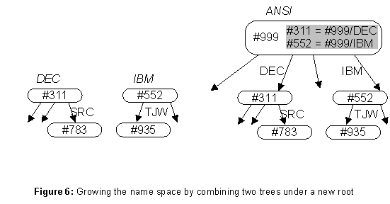 Growth by combining existing name services, each with its own root, is a little trickier. The basic idea is obvious: add a new root, making the existing roots its children. Figure 6 illustrates the creation of a new