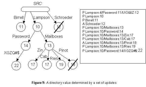 It can be shown that the updates on values defined earlier are total, commutative and idempotent. Hence a set of updates uniquely defines a value. This observation is the basis of the concurrency control scheme, as explained in the next subsection. The right side of figure 9 gives one set of updates that will produce the value on the left.