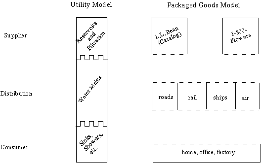 The infrastructure for transporting packaged goods, including air, sea, and ground transportation, differs significantly from the infrastructure for utilities. In the packaged goods transport system, the distribution channel is decoupled from the supply chain and has the remarkable property that it can carry a wide range of commodities.