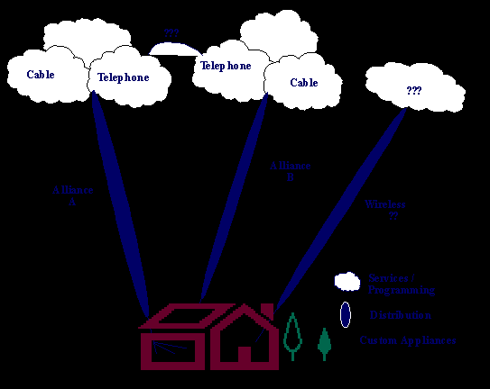 The present belief that competition is the driving force shaping the information industries is leading towards the convergence model (Figure 3). In this model, large alliances of distributors (network providers) and suppliers (content providers) compete with each other [10]. Each alliance will offer consumers the opportunity to purchase bundled (i.e., vertically coupled) information services. Within each geographic region, alliances are forming around the traditional telephony and cable distributors. However, each of these alliances is leveraging digital technology to implement a generic infrastructure that can supply and deliver a wide range of information services.