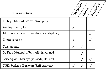 . We refer to this as the analog state. Examples of competitive, specialized, bundled infrastructures are radio, broadcast television, and the pre-AT&T competitive telephony industry. Due to economies of scale, this infrastructure may lead to a natural monopoly () unless the start-up costs are low, as is the case with air waves (where little physical infrastructure need be built).