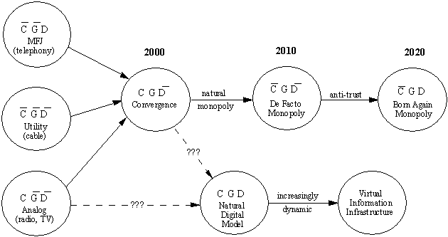 CGD) infrastructure, and how such an infrastructure favors innovation.However, we have also shown that, despite the current emphasis on competition, the present convergence activities could inadvertently establish artificial barriers that would lead us back to a regulated monopoly – one that is generic and thus far more pervasive than those of the past. Ultimately, we believe that the digital properties will destabilize such a monopoly, but only after a lengthy interval. It would be preferable to avoid the monopoly state entirely and proceed directly to a VI. Realizing this vision will require a synthesis of technical and policy efforts and Sections 4 and 5 represent our first pass at enumerating the challenges that lie ahead.