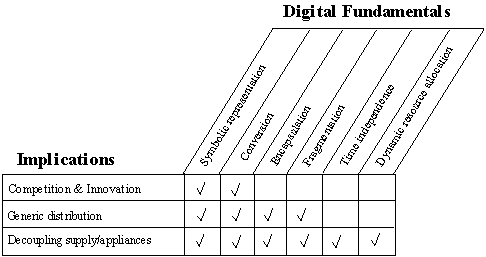 We then focus on the fundamental properties of digitized information and describe how they favor the proposed model. These properties include the ability to represent all digital information symbolically, and in a fundamental unit (the bit); the ease and declining expense of switching and converting the information being distributed; the ability to distribute information over a general-purpose, medium-independent network; and the software-based ability to defer the binding of resources until they are needed. Taken together, these properties enable a much more flexible, dynamic, and heterogeneous infrastructure than is currently being realized either in practice, in industry proposals [3, 4], or in proposed legislation [2, 5-9].