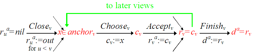 Each view v chooses an anchored value cv: equals any earlier decision.