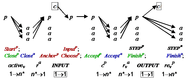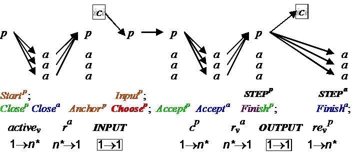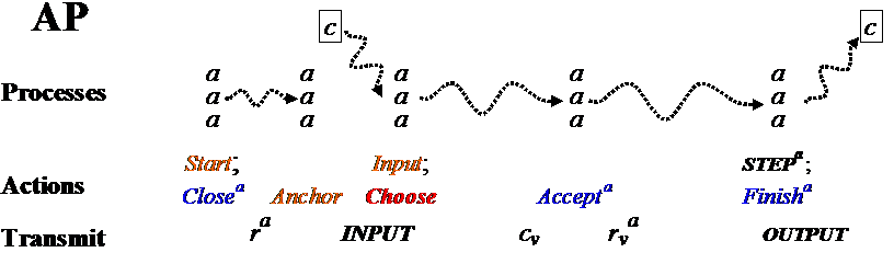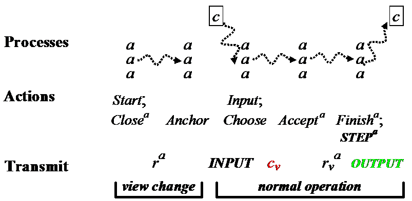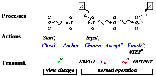 So the primary sends activev to agents to enable Closev, collects ra, computes anchor, gets inputs, does Choose, sends cp to agents, collects ra again to compute rev, and broadcasts d.